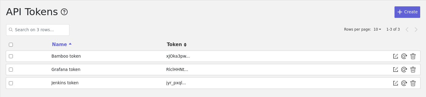 You can edit the API Token permissions by clicking on the icon on the right part of the table. To regenerate a token, click on the icon.
