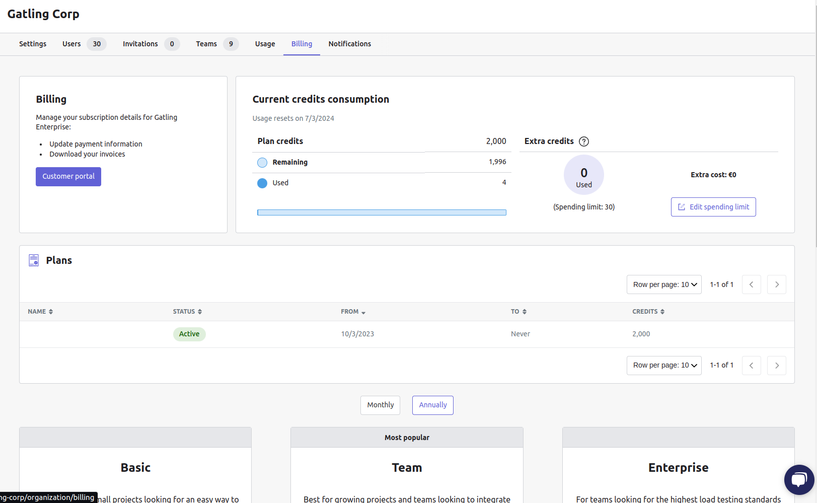 Manage your organization's billing settings, credit consumption, and subscription plans.