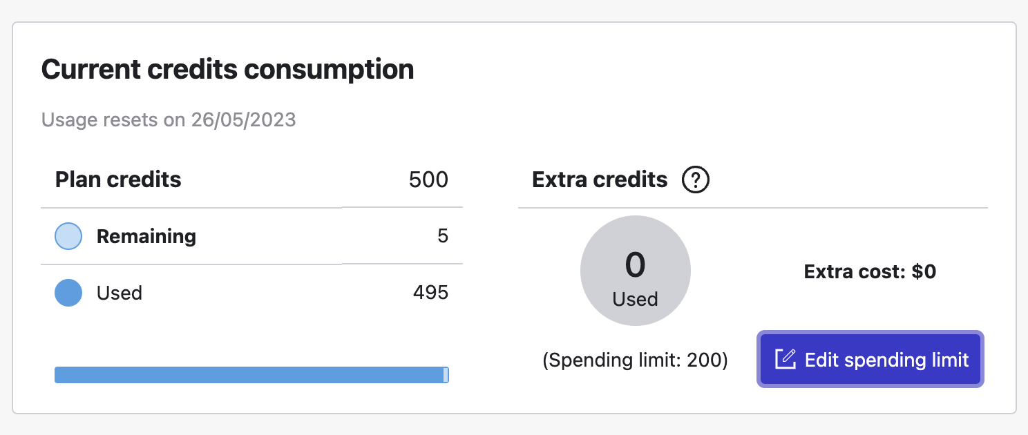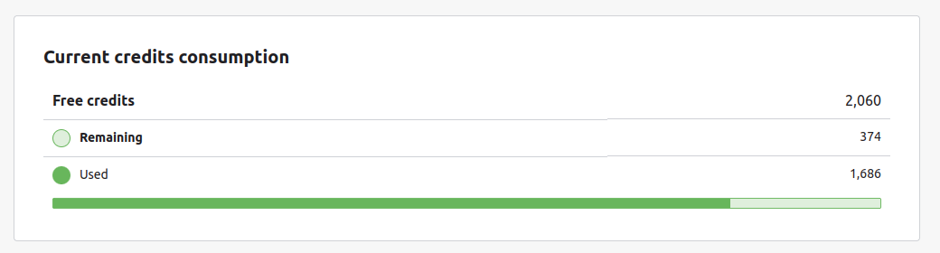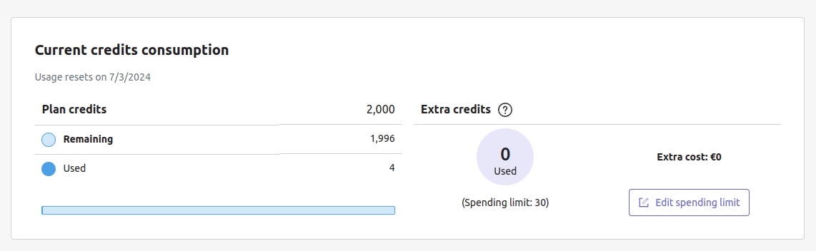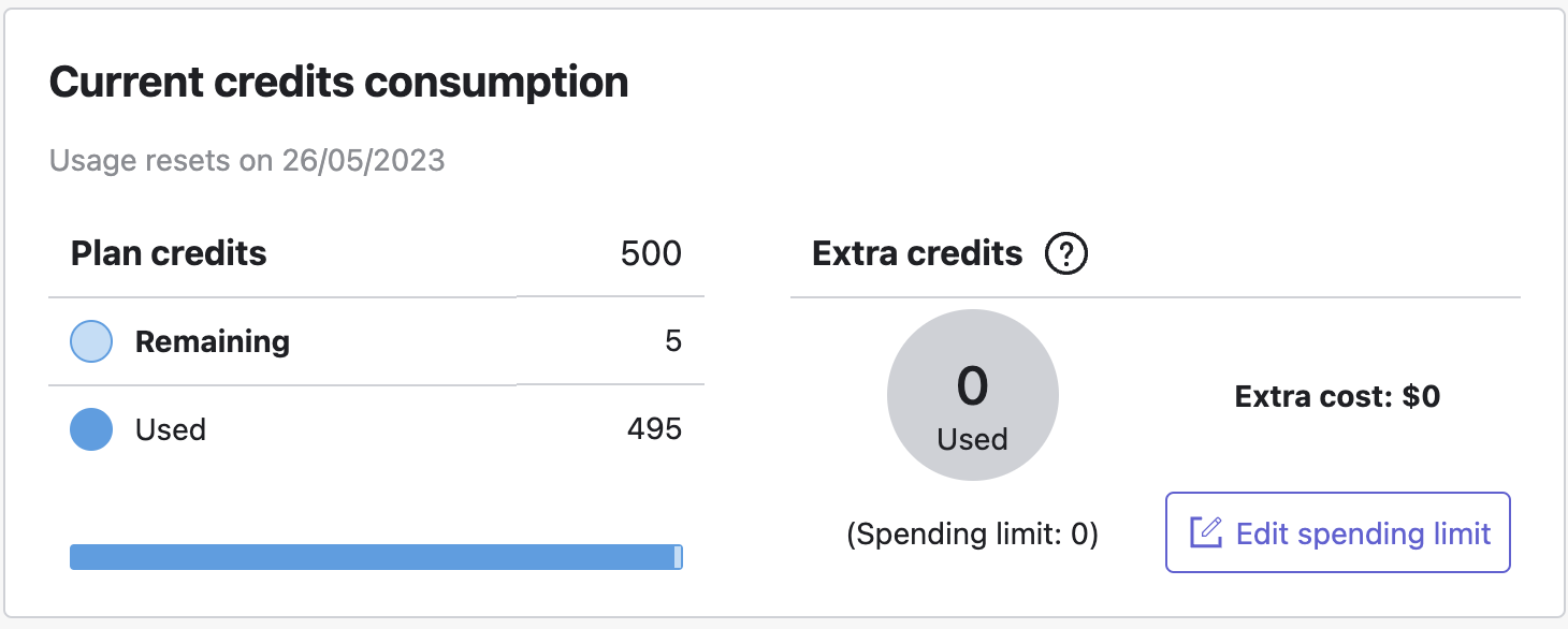 The amount of consumed and remaining credits are displayed for both paid and trial plans. For paid plans, the credits consumed are for your billing period: