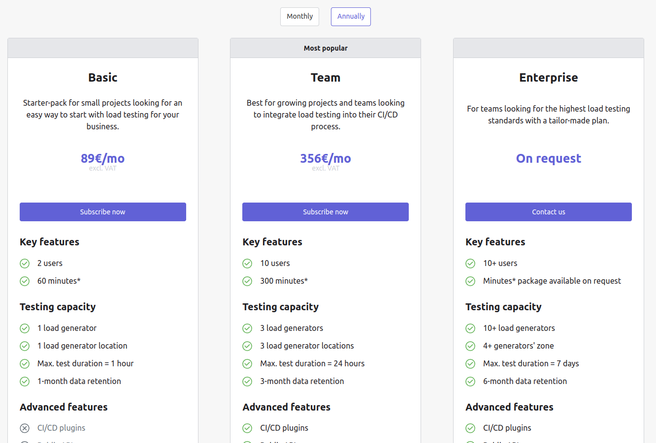 Click on the Subscribe now button in order to buy the desired offer via stripe. If you want to change your current offer, or buy the Custom one, please click on Contact us.