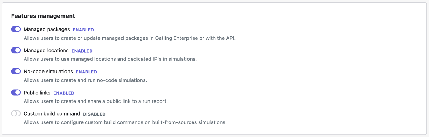 Manage your organization's settings and feature toggles in Gatling Enterprise Edition.